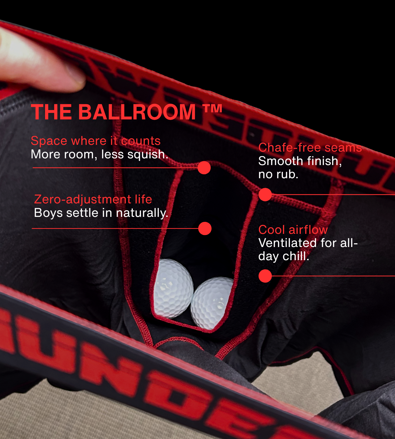 The Ballroom™ Pocket gives them first-class space, airflow, and cooling freedom without the squish, the stick, or the shuffle. No awkward adjustments, no sweaty compromises—just effortless comfort that lasts all day.
